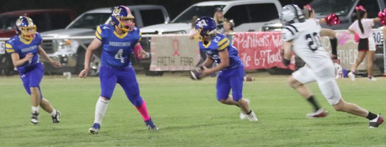 Brownwood linemen Aidan Packheiser (70) and Ian Barrera (67) block for quarterback Judson Coalson (4) during last Friday's District 4-4A Division I football game at Gordon Wood Stadium. (Steve Nash / Brownwood Bulletin).