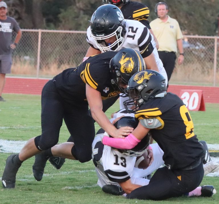 Two Blanket defenders, including Brayden Caine (8), stop a Woodson ball carrier during the Tigers' 56-8 win last week. (Steve Nash / Brownwood Bulletin).